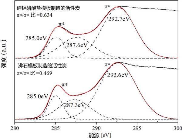 兩種模板化制造活性炭的EELS光譜在圖3顯示。這兩條曲線的sp 2/sp 3碳的分數已經顯示出與碳原子的雜化有關,并且一系列高斯峰被擬合到下的去卷積。定量計算表明,硅鋁磷酸鹽模板化活性炭的光譜在兩個峰之間具有統(tǒng)計學上更高的比率,與無定形碳相比,這兩種活性炭的sp 2/sp 3碳具有更高比例。