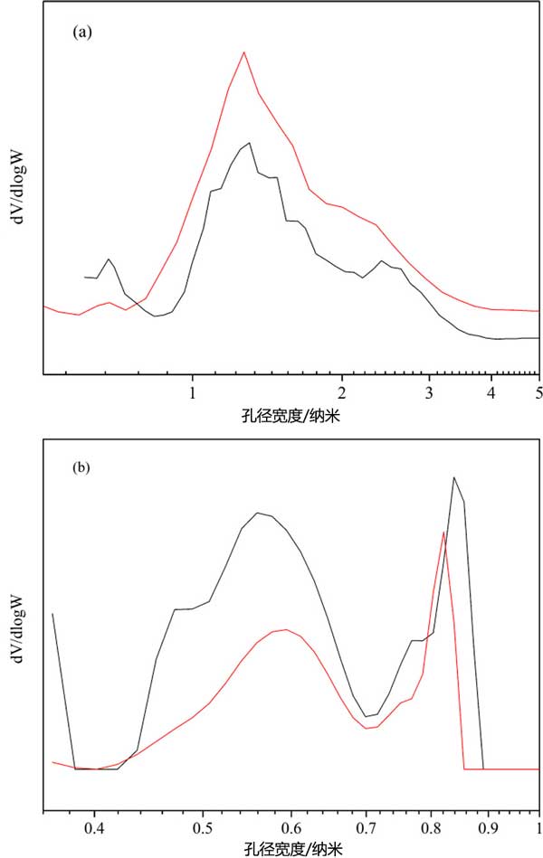圖4:(a)在-196℃下記錄的氮吸附數據和(b)在0℃下記錄的二氧化碳吸附數據計算的活性炭孔徑分布。