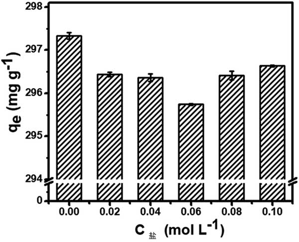染料廢水含有各種鹽類和金屬離子,影響活性炭的吸附效率。在圖2中可以觀察到孔雀石綠對活性炭的吸附能力受鹽濃度的顯著影響。當(dāng)NaCl濃度為0.02mol L-1時,吸附容量意外降低。然而,在將鹽濃度增加到0.10mol L-1的同時,這種負(fù)面影響將變得可以忽略不計。如上所述,靜電相互作用可能在吸附過程中起關(guān)鍵作用。