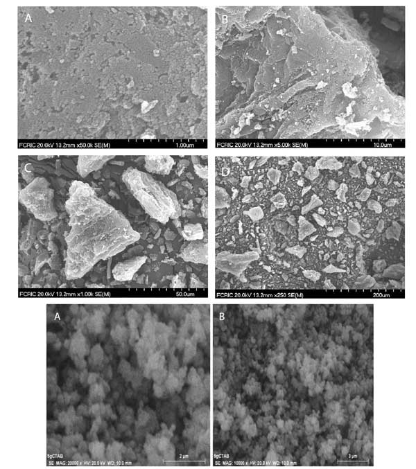 圖1呈現(xiàn)活性炭的掃描電子顯微鏡(SEM)圖像,其示出了活性炭的結(jié)構(gòu)和表面表征。圖像顯示碳顆粒的平均尺寸為約20nm,并且這些顆粒聚集在一起并形成平均尺寸為25μm的角形簇。孔隙率為17.78%?梢钥闯龃氐谋砻媸瞧教沟,粗糙的和多孔的。最后兩幅顯示的活性炭摻雜二氧化鈦的圖像。在嚴(yán)格攪拌下,將丁醇鈦溶液加入到含有活性炭的擬均勻溶液中,可能形成二氧化鈦,其中活性炭顆粒將其裝飾。