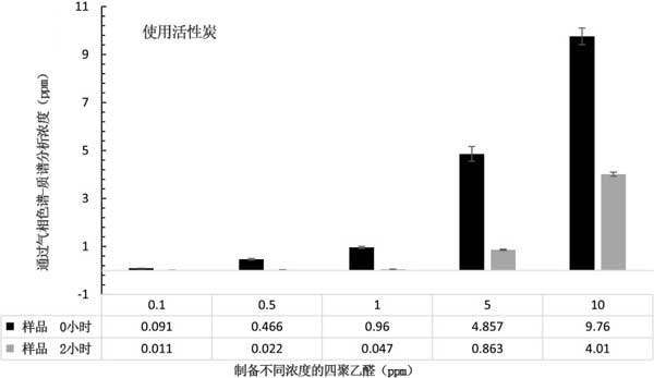 在該組實驗中使用活性炭(0.1g),在UV-C光下,在0.1,0.5,1,5和10ppm下,將不同制備的初始濃度的聚乙醛樣品用于2小時處理。圖2之前和由活性炭處理后聚乙醛的濃度進行比較;钚蕴磕苡行У貜娜芤褐谐チ司垡胰貏e是對于0.1,0.5和1ppm的較低初始濃度(p<0.05)。
