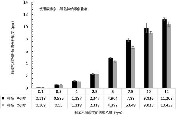 二氧化鈦摻雜的碳催化劑被認為對水中的四聚乙醛降解無效,特別是與活性炭相比。圖3示出了前和2小時處理被碳摻雜二氧化鈦后在溶液聚乙醛的濃度2在UV-C光納米催化劑。在較高的初始濃度的金屬醛溶液如5、7.5、10和12ppm時,與較低濃度的降解相比,降解稍微更顯著(2-9%)。