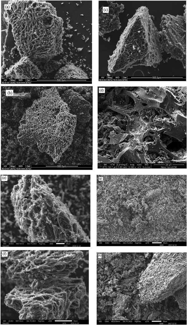 掃描電子顯微鏡圖像顯示在圖1a-h中;钚蕴康牧姿崽幚韺е戮哂锌梢娍紫堵实牟牧(圖1a-c)。然而,仔細觀察后,孔隙結(jié)構(gòu)和尺寸是不同的。20%濃度改性后的活性炭具有稍微細長的孔,40%表現(xiàn)出均勻的圓形孔,而60%顯示出細長和圓形毛孔的混合。這些觀察結(jié)果表明,不同濃度的磷酸活化的活性炭具有不同的物理屬性。在這種情況下,磷酸是活化劑,并且在加熱時產(chǎn)生孔道,因為它從碳中逸出,從而帶走一些萃取劑。圖1d描繪了具有小孔的粗糙紋理,圖1e顯示了類似巢的類型的孔,圖1f顯示了孔的破壞和變寬?捉Y(jié)構(gòu)和孔體積的變化可歸因于活化劑的強度增加。濃度較高的硝酸會破壞表面基團。因此,需要使用最佳濃度的活化劑來防止損害吸附劑的表面特性。濃度太高可能導致結(jié)合官能團的提取,使吸附劑吸附性差。