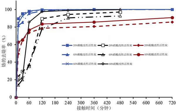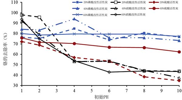 對鉻實現(xiàn)有效吸附所需的較高劑量可能意味著用硝酸,硫酸對活性炭進行化學氧化和磷酸除去吸附位點。具體地,當考慮所用的劑量和初始濃度時,硫酸和磷酸改性產(chǎn)生的活性炭與沒改性的相比具有較差的性能。因此,基于使用不同前體的研究,不能推廣酸改性對活性炭性能的影響。對于不同濃度硫酸磷酸改性和20%硝酸改性活性炭,在pH 1下各種吸附劑的處理能力都超過75%最大的硝酸改性活性炭達到了98%,而磷酸改性活性炭的那些性能最大。總的來說,20%硝酸改性的活性炭才是去除鉻的最佳吸附劑。
