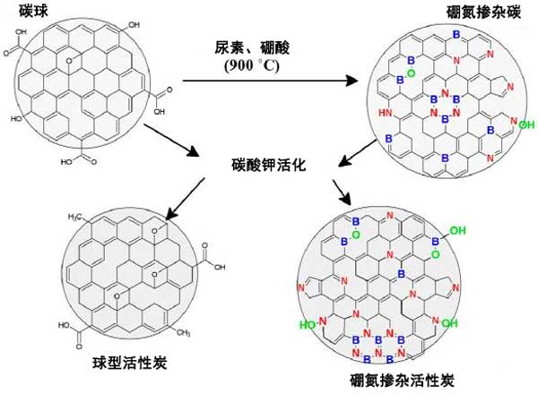 圖1:硼和氮共摻雜活性炭與碳酸鉀活化的機(jī)制。