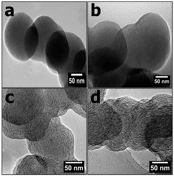 圖2:(a)碳球(b)硼氮摻雜碳(c)活性炭和(d)硼氮摻雜活性炭的高放大率TEM圖像。