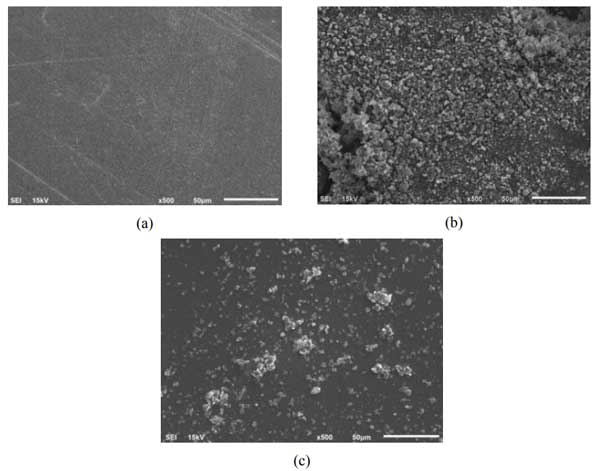 圖1:(a)殼聚糖膜,(b)活性炭和(c)殼聚糖復合膜的SEM分析。
