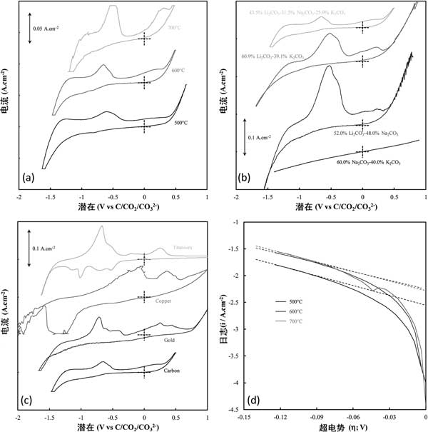 圖1:(a)活性炭的溫度,(b)發(fā)生沉積的熔融碳酸鹽電解質(zhì),以及(c)發(fā)生沉積的基板。(d)與在500-700°C的溫度下沉積的碳的碳沉積開始有關(guān)的Tafel峰的陰極Tafel曲線和計(jì)算的Tafel線(虛線)。