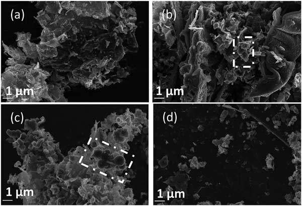 圖2:在其他標(biāo)準(zhǔn)條件下以20 kV放大倍數(shù)拍攝的碳沉積(a)0.15,(b)0.30,(c)0.60和(d)1.20 A cm-2時(shí)拍攝的SEM圖像。