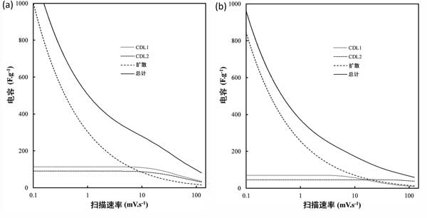 圖4:掃描速率對(duì)(a)以活性炭和其他標(biāo)準(zhǔn)條件以及(b)活性炭對(duì)總電容的貢獻(xiàn)的影響。C D表示由于擴(kuò)散引起的電容,而C DL1和C DL2分別表示與納米和微孔表面積以及外部碳表面積相關(guān)的雙層。