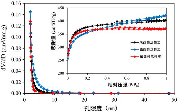 表面積和孔徑?jīng)Q定了吸附劑的吸附性能;钚蕴烤哂写罅康膬(nèi)部孔,具有較大的比表面積。HNO 3和Fe 對改性活性炭的BET表面積,BJH平均孔徑和孔體積均有不同程度的變化。在常溫條件下,濃HNO 3在活性炭表面溶解了一定的灰分,有助于進一步擴大多孔結(jié)構(gòu)。但是,濃HNO 3還腐蝕了活性炭的結(jié)構(gòu),從而部分破壞了內(nèi)部通道結(jié)構(gòu)并降低了活性炭的比表面積。至于鐵改性的活性炭,內(nèi)表面的鐵材料層堵塞了某些通道,從而降低了比表面積,平均孔徑和孔體積。