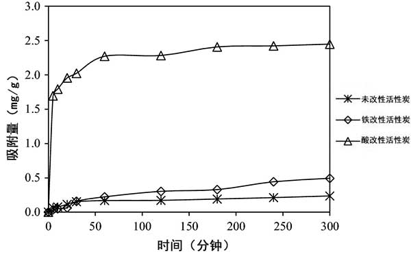 吸附動力學(xué)主要用于確定吸附過程的保留時間。圖3顯示了砷離子在活性炭纖維上的吸附動力學(xué)。如圖3所示 ,砷離子的吸附隨著接觸時間的增加而增加,并且考慮到處理效率,吸附平衡時間固定為60分鐘。與活性炭的吸附過程相比,F(xiàn)e和HNO 3改性后的活性炭吸附平衡時間增加,但在300分鐘時的吸附容量分別為0.236 mg/g,0.493 mg/g和2.45 mg/g。因此,鐵改性的活性炭提高了去除砷離子的吸附能力。