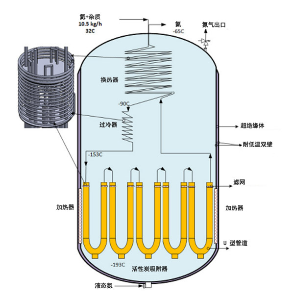 低溫單元是一系列熱交換器,稱為冷阱和活性炭吸附柱,它們浸入裝有液氮的容器中。該系列熱交換器是氦氦換熱器(HE的管中管類型)。過冷器將氦氣溫度降低至-153°C。吸附器將一根裝有活性炭的U型管立柱。如圖2所示,在色譜柱周圍安裝了一個(gè)電加熱器以進(jìn)行再生。低溫容器是雙壁容器,其中壁之間的間隙中充滿了超絕熱材料。該容器裝有液氮,并將吸附過程保持在低溫(±180°C)下。