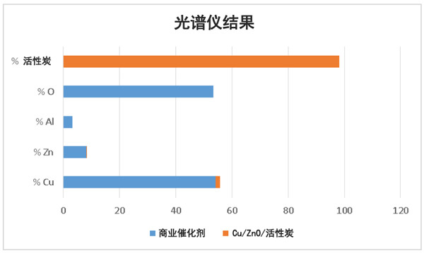 活性炭催化劑的制備,采用浸漬法制備了Cu/ZnO/活性炭催化劑。硝酸銅和硝酸鋅是將附著在活性碳上的銅和氧化鋅載體的原材料。Zn起促進劑的作用,以防止Cu的燒結(jié)。銅將在催化劑上被氧化并寫為銅[Zn]。之后,來自CuO分子將為CuO/ZnO相的形式。其還原將受到ZnO的影響。制備活性炭催化劑后,然后通過XRF,XRD,SEM和BET表面積分析儀對催化劑進行表征。商業(yè)催化劑和Cu/ZnO/活性炭催化劑的XRF分析見圖2。