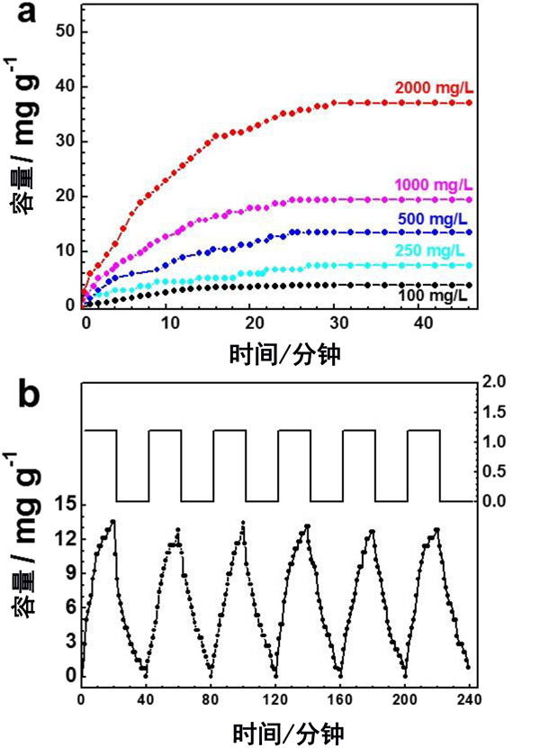 圖3:(a)在不同的NaCl濃度下活性炭的電吸附動力學,(b)活性炭電極在NaCl電解質中的電吸附和再生循環(huán)。