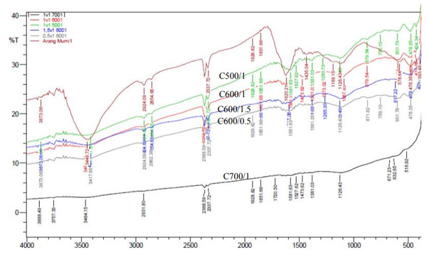 對于峰的強(qiáng)度,活化溫度在降低強(qiáng)度中起重要作用。較高的溫度將產(chǎn)生具有較少官能團(tuán)的活性炭。最高活化溫度樣品顯示幾乎平坦的光譜。同時(shí),對于活化劑定量,效果很小。比率從0.5增加到1.5似乎對樣品的化學(xué)性質(zhì)沒有任何影響,因?yàn)槿齻(gè)光譜相似。