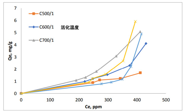 圖3顯示了鈣離子的吸附等溫線。等溫線表示分類的I型或II型。較低溶液濃度下的小肩部可能暗示了鈣離子微孔填充的單層吸附飽和。這表明孔表面與鈣離子之間的相互作用較強(qiáng)。活性炭的低孔隙度仍表示III型等溫線,因?yàn)闆]有明顯的微孔可以被鈣離子填充,而不是外表面和大孔。