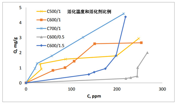 從圖2中可以看出,活性炭在不同的活化溫度(500℃,600℃和700℃)和活化劑比率(0.5、1.0和1.5)下的鋰吸附等溫線。似乎在較低濃度下吸附能力相對較低。這表明鋰離子對活性炭表面的親和力低。高濃度下容量的增加與孔隙率成正相關(guān);钚蕴康妮^大表面積傾向于更多地吸附鋰離子。在等溫線的分類中,該等溫線被認(rèn)為是III型等溫線,對于無孔或大孔吸附劑來說是典型的。因此,鋰離子似乎不附著在微孔內(nèi)部,而是附著在外部和大孔表面;钚蕴繉︿囯x子的親和力低。炭表面的碳原子與溶液中的鋰離子之間的低相互作用可能是由于離子的原子質(zhì)量低所致。原子間勢相互作用表明該力與相互作用原子的原子質(zhì)量以及原子之間的距離具有正相關(guān)。