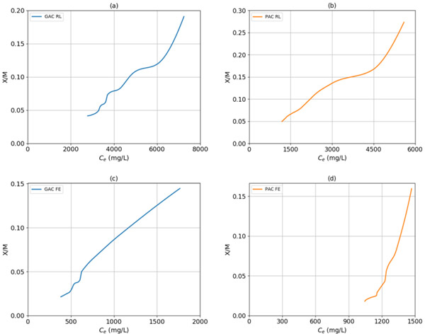 圖1顯示了顆粒活性炭與原浸出液,粉狀活性炭與原浸出液,粉狀活性炭與廢液以及粉狀活性炭與廢液的實驗等溫線。兩個樣品的曲線和兩個活性炭對應(yīng)于S形的等溫線(II型)的行為,因為曲線是凹向上,所以多層吸附進(jìn)行活性炭的表面上。利用該信息,就滲濾液而言,不管活性炭顆粒的性質(zhì)和大小如何,都可以假定吸附劑中殘留的化學(xué)需氧量是通過物理吸附發(fā)生的。