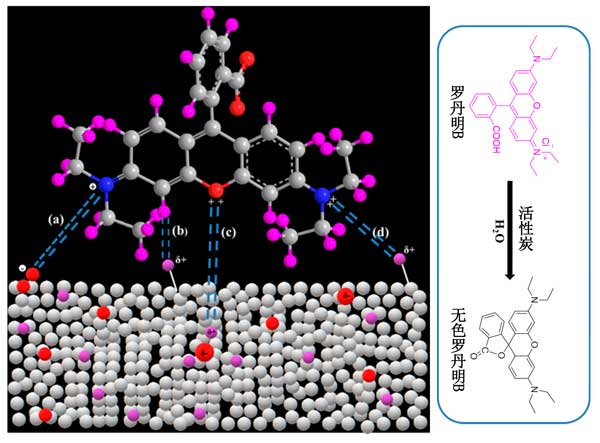 羅丹明B降解機(jī)理示意圖;钚蕴康谋砻嫔洗嬖趲讉(gè)官能團(tuán),它們可以與羅丹明B染料分子相互作用。可能的相互作用簡述如下:(a)活性炭的–COOH基團(tuán)與羅丹明B的負(fù)電性基團(tuán)之間的相互作用,(b)活性炭的–OH基團(tuán)與羅丹明B的芳環(huán)之間的氫鍵,(c)氫鍵活性炭的–OH基團(tuán)與羅丹明B的x噸基團(tuán)之間存在(d)活性炭和羅丹明B染料分子的表面官能團(tuán)之間的靜電相互作用。