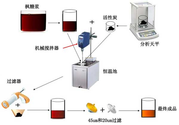 根據(jù)實驗測試活性炭使黑楓糖漿變色的機(jī)制,使用食品級活性炭作為吸附材料,以改善深色楓糖漿的顏色和氣味/味道,從而生產(chǎn)與淡糖漿或琥珀色糖漿。圖1說明了該測試中使用的變色過程。為了進(jìn)行實驗,我們使用了不同量的活性炭(0.01、0.03和0.05 g),并引入10 mL楓糖漿樣品中,以得到0.1、0.3和0.5g/100 mL的最終濃度。然后,將混合物放入恒溫池中,以便通過使用電動攪拌裝置來調(diào)節(jié)工作溫度和攪拌速度。攪拌(混合)時間設(shè)置為20、40和60分鐘。在混合時間結(jié)束時,首先通過使用簡單的紙過濾器過濾混合物,以去除使用過的活性炭的大顆粒。通過使用兩個分別具有45和20μm的篩孔尺寸的注射器過濾器進(jìn)行第二次過濾。