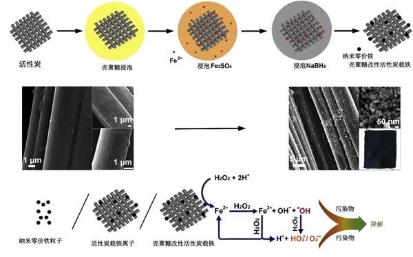 本次一共制備了三種類型的非均相Fenton催化劑,分別是納米零價鐵顆粒,活性炭負載的納米零價鐵和浸漬有納米零價鐵的殼聚糖改性活性炭。通過在活性炭上吸收鐵離子,然后使用NaBH 4原位還原,合成了活性炭負載的納米零價鐵。殼聚糖改性活性炭的制備方法是,先在酸洗過的活性炭上涂覆一層殼聚糖,然后將亞鐵離子螯合到殼聚糖基質中,然后將其原位還原為納米零價鐵。這幾種活性炭催化劑的合成過程示意圖如圖1所示。
