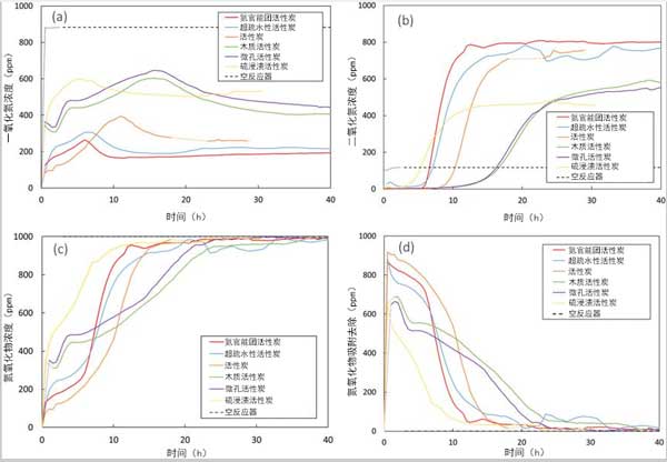 為了測試活性炭在環(huán)境溫度下對氧化和去除的催化和吸附性能。這些簡化的條件與實際煙氣條件大不相同,后者具有不同的成分和雜質(zhì),并且在不同的壓力和溫度下。但是,這些條件使我們能夠簡化復(fù)雜的系統(tǒng),以更好地了解NO氧化。圖中顯示了在干燥條件下,環(huán)境溫度和壓力下不同活性炭在NO氧化過程中NO,NO 2和氮氧化物的濃度分布圖。NO氧化轉(zhuǎn)化率與運行時間的關(guān)系也可以由NO濃度來計算的。還計算了每個給定時間的NO入口和氮氧化物出口濃度之間的差異,并顯示為通過吸附去除的氮氧化物量。基線測試代表在相同條件下通過使用無活性炭催化劑的空反應(yīng)器進行的測試。穩(wěn)態(tài)NO轉(zhuǎn)化率,氮氧化物的累積量吸附,以及所需要的時間,以達到最大的NO濃度或吸附的突然釋放NO 2的出口流中還從濃度曲線中獲得了這些元素。