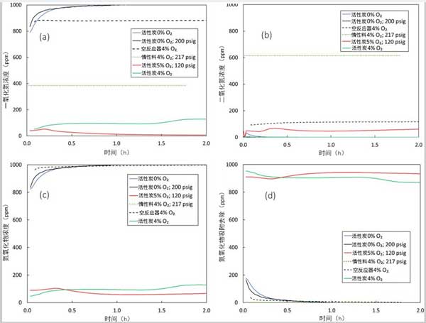 在大氣或高壓下沒有氧氣的情況下進行的基線活性炭測試中吸附的NO,NO 2,氮氧化物和氮氧化物的濃度曲線證實,即使在200 psig的高壓下也不會發(fā)生NO 2的形成或大量NO的吸附。在沒有氧氣的情況下,活性炭催化劑上沒有NO吸附。即使在200 psig下,NO也無法物理吸附在活性炭表面上,而且氧氣的存在也是必不可少的以促進NO在化學(xué)吸附的氧位點上的化學(xué)吸附。