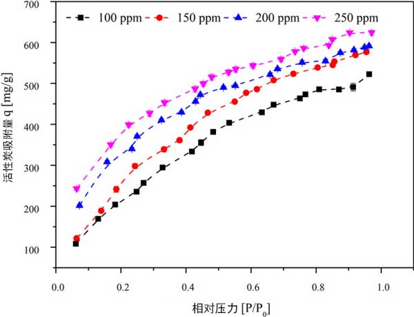 為了確定三氯乙烯初始濃度在進(jìn)料流中的影響,研究了100、150、200和250ppm的濃度。維持其他實(shí)驗(yàn)條件,活性炭顆粒大小為355μm,床溫為30°C,活性炭重量為50mg。入口濃度為100、150、200和250ppm時(shí)的吸附容量分別為523.252、575.844、593.181和624.044mg/g。隨著入口三氯乙烯濃度的增加,在壓力增加的情況下,活性炭的吸附容量顯示出穩(wěn)定的增加。在較高濃度下,隨著壓力的增加,吸附容量的增加可能是由于相鄰分子與微孔中的層內(nèi)分子粘附所致。這導(dǎo)致形成粘附在吸附劑表面上的層內(nèi)分子的相鄰三氯乙烯分子堆疊。三氯乙烯分子的平面形狀的動(dòng)力學(xué)直徑為6.6。因此,它會(huì)積聚在活性炭的微孔/中孔上。在活性炭的微孔區(qū)域中具有大孔體積的情況下,假設(shè)縫隙形狀的孔幾何形狀,則期望對活性炭上的三氯乙烯具有高親和力。在低濃度(0-8000μg/L)的活性炭上進(jìn)行了三氯乙烯的吸附,在室溫下吸附量為160mg/g。
