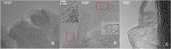 選擇了三種活性炭,代表三種不同的孔幾何形狀,同時(shí)保留了化學(xué)均一的吸附表面和可比較的孔徑。選定的樣品是由隨機(jī)排列的石墨層組成的活性炭,具有狹縫孔幾何形狀的碳化鈦衍活性炭和具有圓柱孔幾何形狀的活性炭納米管樣品。對活性炭納米管進(jìn)行熱處理,以去除端蓋,并使氣體進(jìn)入內(nèi)部孔隙。選擇加熱條件以將活性炭納米管的開孔率和BET表面積調(diào)整到與其他兩個(gè)碳樣品相當(dāng)?shù)乃,同時(shí)還清潔表面并去除雜質(zhì)。所有三個(gè)樣品的特征如下:使用透射電子顯微鏡(TEM)圖1證明了這些材料的孔幾何形狀的差異。