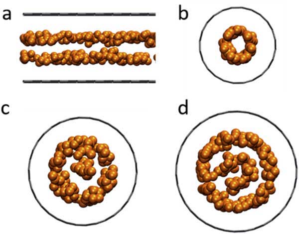 圖3:模擬結(jié)果獲得的氫良好堆積和取向,氫被限制在孔徑為0.66nm的狹縫形孔和孔徑為0.60nm,0.99nm和1.16nm的孔中,氫分子用單個(gè)金球表灰線表示活性炭原子。