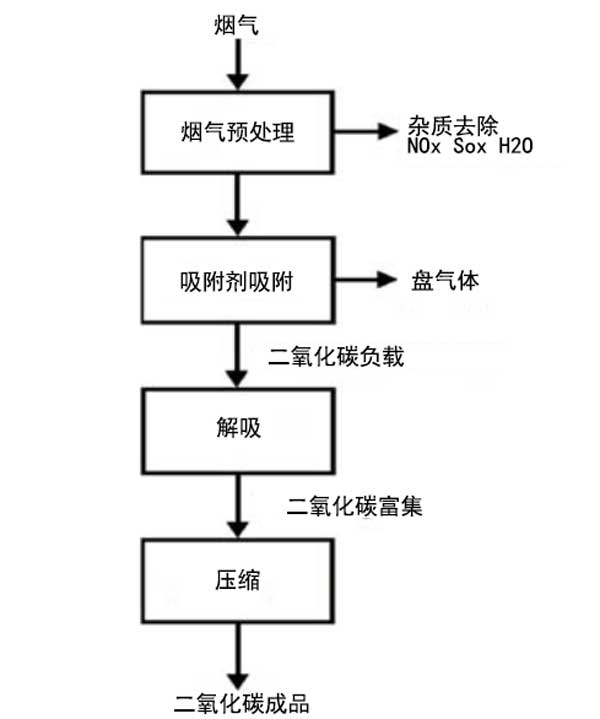 二氧化碳的吸附技術(shù)的簡化圖在圖二顯示。首先將煙氣中的水分,硫和氮氧化物凈化。然后,所制備的氣體進(jìn)入使用固態(tài)吸附劑的吸附階段,例如活性炭,沸石,金屬有機(jī)骨架,多孔聚合物,基于堿金屬和胺的碳酸鹽的固體材料,碳球等。之后,吸附劑進(jìn)入解吸階段,在此階段釋放出富含CO2的氣體混合物,然后在壓力下將其壓縮。該技術(shù)的優(yōu)點(diǎn)是二氧化碳萃取效率高,再生成本低以及吸附劑操作的穩(wěn)定性;钚蕴繉O2和N2的吸附能力很高,具有不同于沸石的大比表面積,并且還可以在潮濕條件下工作。而且,活性炭比沸石具有更低的吸附熱,因此它們可以更容易地再生。因此,在25°C和1bar的溫度下,活性炭的吸附熱為3kJ,而沸石為30kJ。收集二氧化碳的吸附劑質(zhì)量的重要指標(biāo)之一是二氧化碳的吸附量;旧,在靜態(tài)條件下和動態(tài)條件下都進(jìn)行吸附容量的研究。