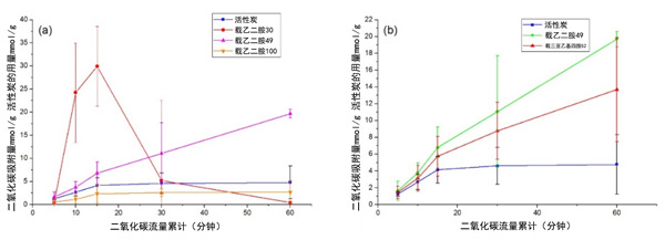 圖1:活性炭和(a)活性炭載乙二胺對(duì)二氧化碳的吸附能力,(b)活性炭載乙二胺和三亞乙基四胺的對(duì)比。