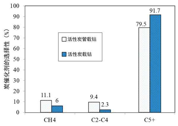 費(fèi)托合成試驗(yàn)是在210℃和2.5MPa的內(nèi)徑為12mm的不銹鋼固定床管式反應(yīng)器中進(jìn)行的。將0.5g催化劑與5.0g碳化硅稀釋劑的反應(yīng)混合物裝入反應(yīng)器中。催化劑在425℃下在N2中的33vol%H2中原位還原10小時(shí)。還原后,將反應(yīng)器冷卻至180℃,并將H2/N2氣體混合物切換為合成氣(H2:CO為2∶1)。在合成氣加壓至2.5MPa然后在4小時(shí)內(nèi)重新加熱到210°C來(lái)完成反應(yīng)。活性炭載鈷催化劑,活性炭納米管載鈷催化劑的CO轉(zhuǎn)化率分別為13.1%,6.7%。產(chǎn)物選擇性的結(jié)果在圖2中給出。與活性炭管樣品相比,活性炭產(chǎn)生更高的C5+和更低的CH4選擇性,這對(duì)氣體產(chǎn)物(C1-C4)也產(chǎn)生最高的選擇性。