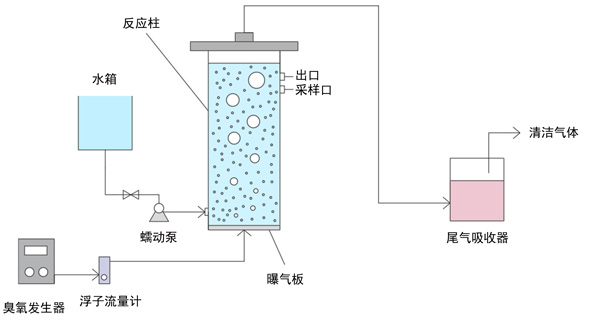 臭氧的反應(yīng)裝置如圖1所示。它主要由高硼硅酸鹽玻璃和臭氧發(fā)生器制成。反應(yīng)器高度為500mm,外徑和內(nèi)徑分別為70和65mm,有效容積為1.5L。反應(yīng)器中臭氧氣體的流量可控制在100mL分鐘以內(nèi)。反應(yīng)器中的氣體分配器是鈦板,其孔隙率約為20%至30%,微孔的平均孔徑約為17μm。臭氧反應(yīng)尾氣的吸收溶液為濃度為1.5mol/L。對色度為600的模擬水楊酸異羥肟酸廢水500mL進行采樣,并將其放入燒杯中。將制得的活性炭量0.03、0.06、0.09、0.12、0.15和0.18g/L樣品分別添加到前一溶液中,然后用磁力攪拌器混合以達到吸附平衡,分析處理后的上清液的色度以評價處理效果。