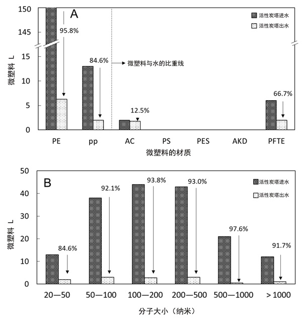 在污水處理廠的進(jìn)水和出水中觀察到未處理的污水樣品中觀察到七個(gè)不同的微塑料顆粒,包括聚乙烯(PE),聚丙烯(PP),丙烯酸酯(AC),聚苯乙烯(PS),聚酯(PES),醇酸樹脂(AKD)和聚四氟乙烯(PTFE)。PE是最豐富的MP材料類別,占MP顆?倲(shù)的72%,其次是PP(13%),AC(6%)和其他分?jǐn)?shù)相對(duì)較小的聚合物(1-4%)。假定樣品中微塑料材料類別的數(shù)量順序與原料的比重有關(guān)。具有較低比重的微塑料顆?梢酝ㄟ^(guò)從污水源沉降到污水處理廠的過(guò)程中,以較低的重力進(jìn)行更有效的輸送。在中試規(guī)模活性炭裝置的進(jìn)水和出水中觀察到的MP顆粒的數(shù)量濃度和尺寸分布分別顯示在圖2AB中。通過(guò)活性炭處理,可以顯著提高微塑料的去除率(92.9%)。特別是,發(fā)現(xiàn)活性炭處理在去除比水輕的微塑料(例如PE和PP)以及所有尺寸范圍的微塑料(包括20–50µm尺寸)方面都是有利的,而初級(jí)和生物處理很少去除這些微塑料。關(guān)于微塑料去除效率,配備活性炭過(guò)濾系統(tǒng)的飲用水處理廠獲得了類似的結(jié)果(大約89%的去除率)。