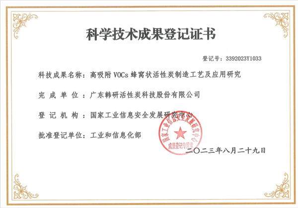 本次科學技術(shù)成果鑒定由國家工業(yè)信息安全發(fā)展研究中心依據(jù)《中華人民共和國科學技術(shù)進步法》、《中華人民共和國促進科技成果轉(zhuǎn)化法》、《科學技術(shù)評價辦法》、《科技評估管理暫行辦法》,在北京主持召開由韓研股份研發(fā)的“高吸附 VOCs 蜂窩狀活性炭制造工藝及應用研究”科技成果評價會。期間嚴格按照《科技成果評價試點暫行辦法》的有關(guān)規(guī)定和要求,秉承客觀、公正、獨立的原則,聘請專家對該項科技成果進行評價。評價委員會聽取了項目完成單位的技術(shù)總結(jié)報告,對評價資料進行了審查,經(jīng)嚴格質(zhì)詢和充分討論形成一致意見:本技術(shù)成果達國際先進水平。